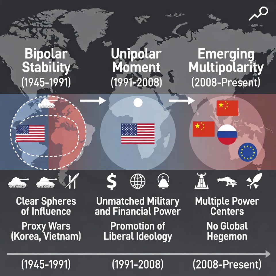 Bipolar Stability (1945-1991): The Cold War established clear spheres of influence under American and Soviet hegemony. While proxy conflicts proliferated at the periphery, the nuclear balance of terror imposed restraint on direct great power confrontation. International institutions functioned as venues for managed competition rather than genuine collective governance.